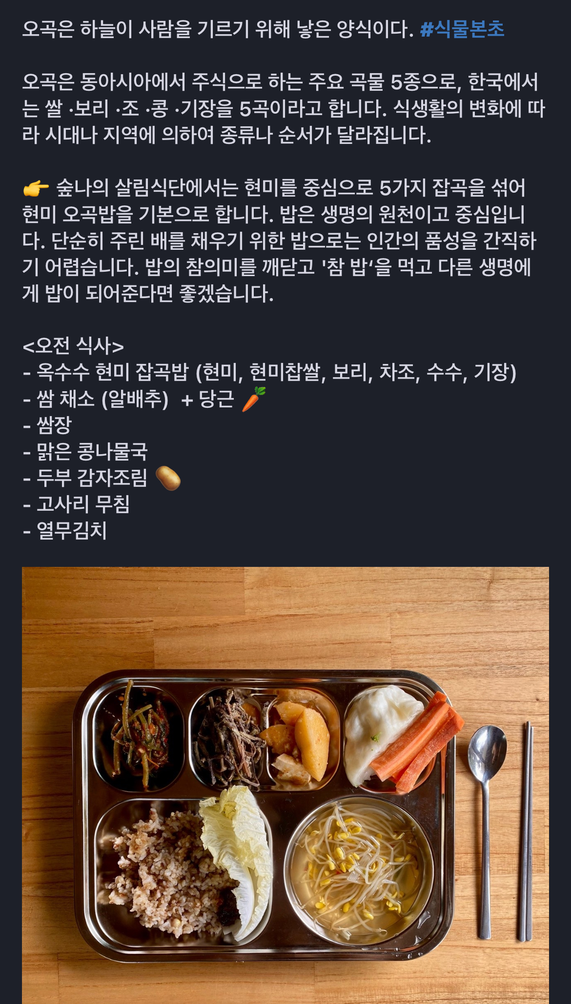 - 곡물, 채소, 콩 등 식물성 식재료로 구성된 균형 잡힌 메뉴를 제공합니다.