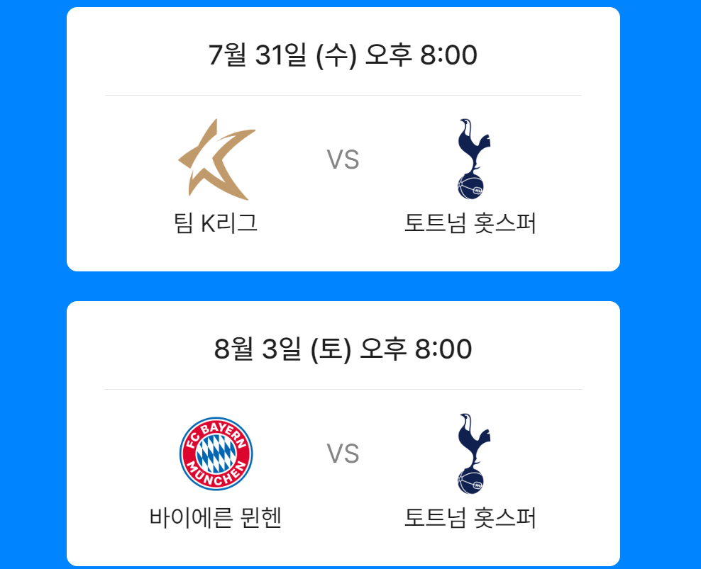 - 이번 쿠팡 플레이 시리즈에서 팀 K리그는 7월 31일 수요일 오후 8시에 토트넘 홋스퍼 FC와 친선경기를 치를 예정입니다. 주중 경기이기는 하지만,엄청난 인기와 함께 매진을 기록했기 때문에 서울 월드컵 경기장이 가득 찰 것으로 기대됩니다. 8월3일 하프타임때 뉴진스의 공연도 기대가 됩니다!!